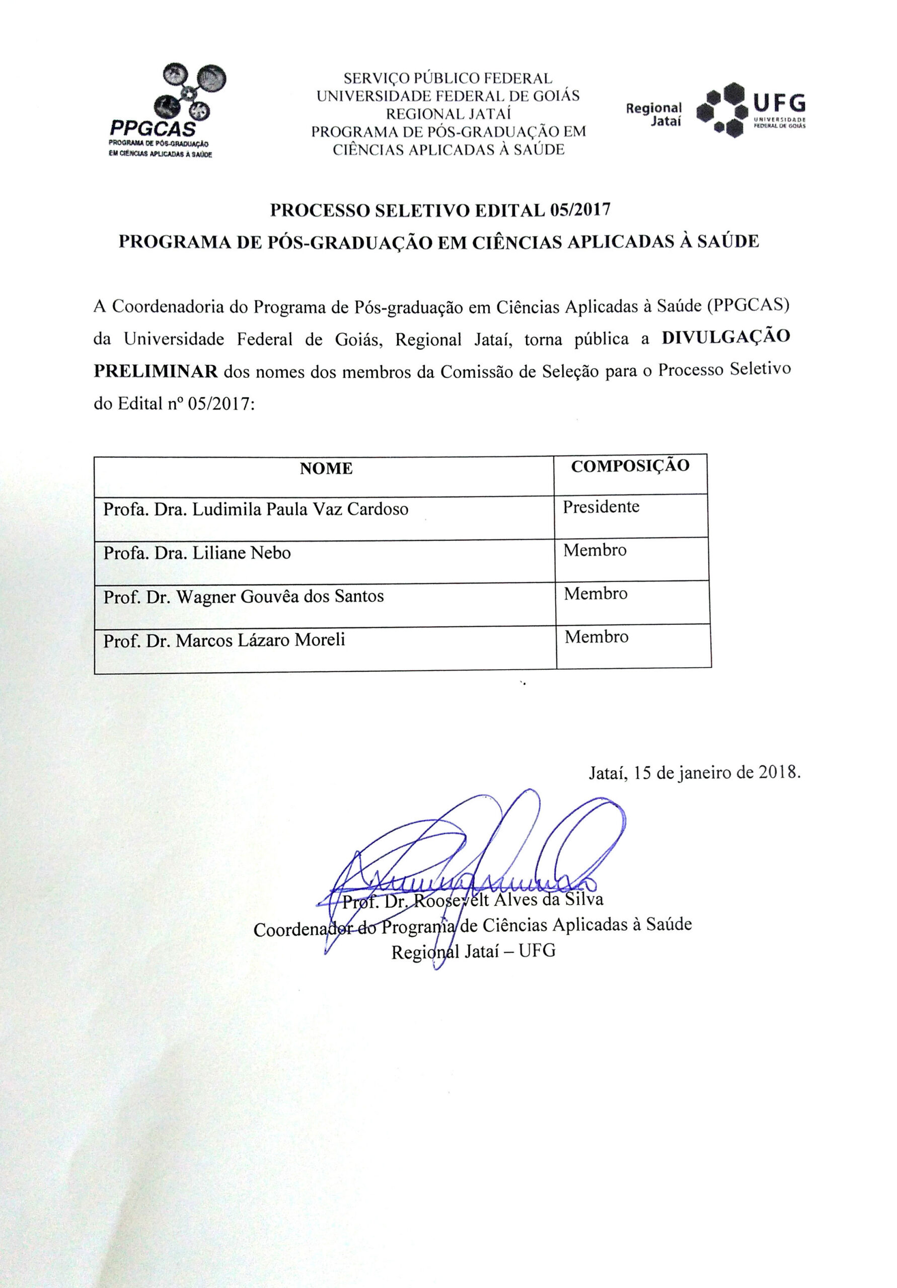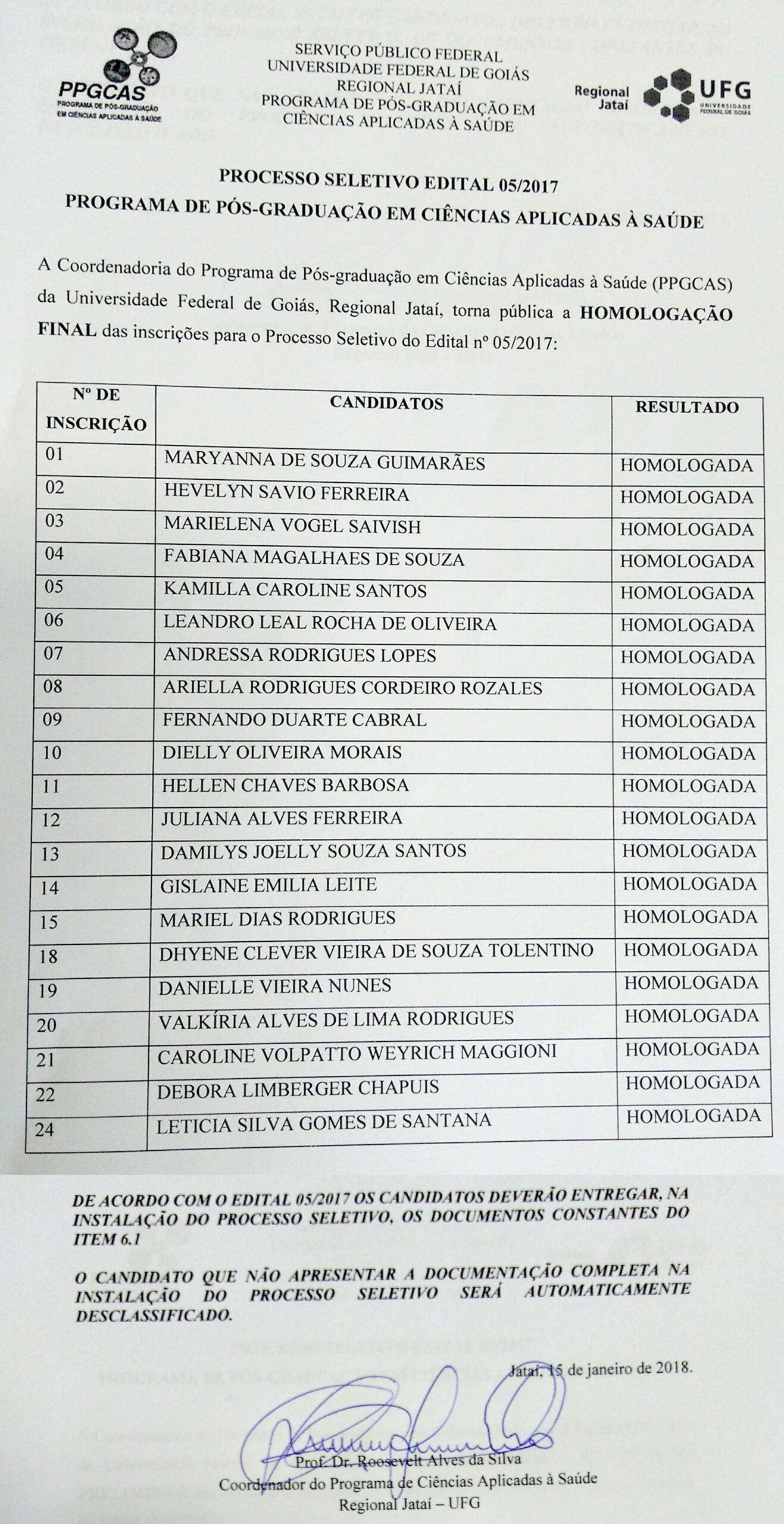 A Coordenadoria do Programa de Pós-graduação em Ciências Aplicadas à Saúde (PPGCAS) – Nível Mestrado da Universidade Federal de Goiás, Regional Jataí, vem tornar público aos interessados que estarão abertas as inscrições para o seu Processo Seletivo, turma 2018, no período de 22/11/2017 a 05/01/2018, de segunda-feira a sexta-feira, exceto feriados, nos horários de 08:00 às 17:00 h, na Secretaria Geral da Pós-graduação ou via email (sgp.ufg@gmail.com). Outras informações poderão ser obtidas na Secretaria do Geral da Pós-graduação, situada no prédio da Pós-graduação da Universidade Federal de Goiás, Regional Jataí, Campus Jatobá, Cidade Universitária, BR 364, Km 192, Pq. Industrial 3800, CEP: 75801-615 – Jataí/Goiás – telefone (64) 3606-8331 – e-mail: sgp.ufg@gmail.com.